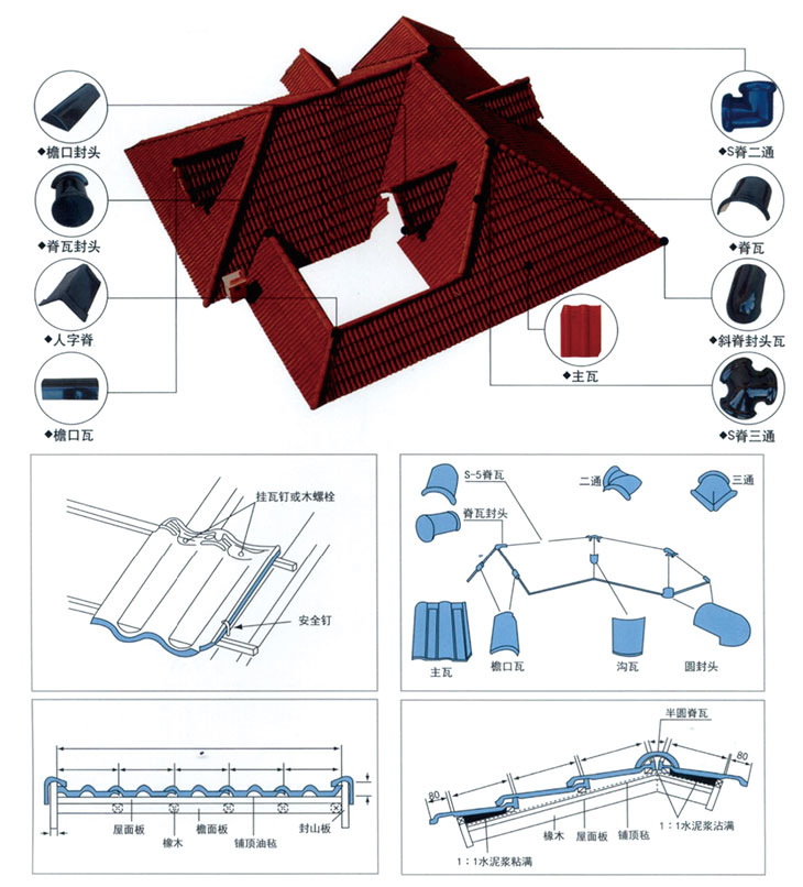 5、檐口瓦最多超出距离≤10mm,并且用1:1水泥浆粘贴,但纵向应留有空隙。瓦侧面应用安全钉固定。